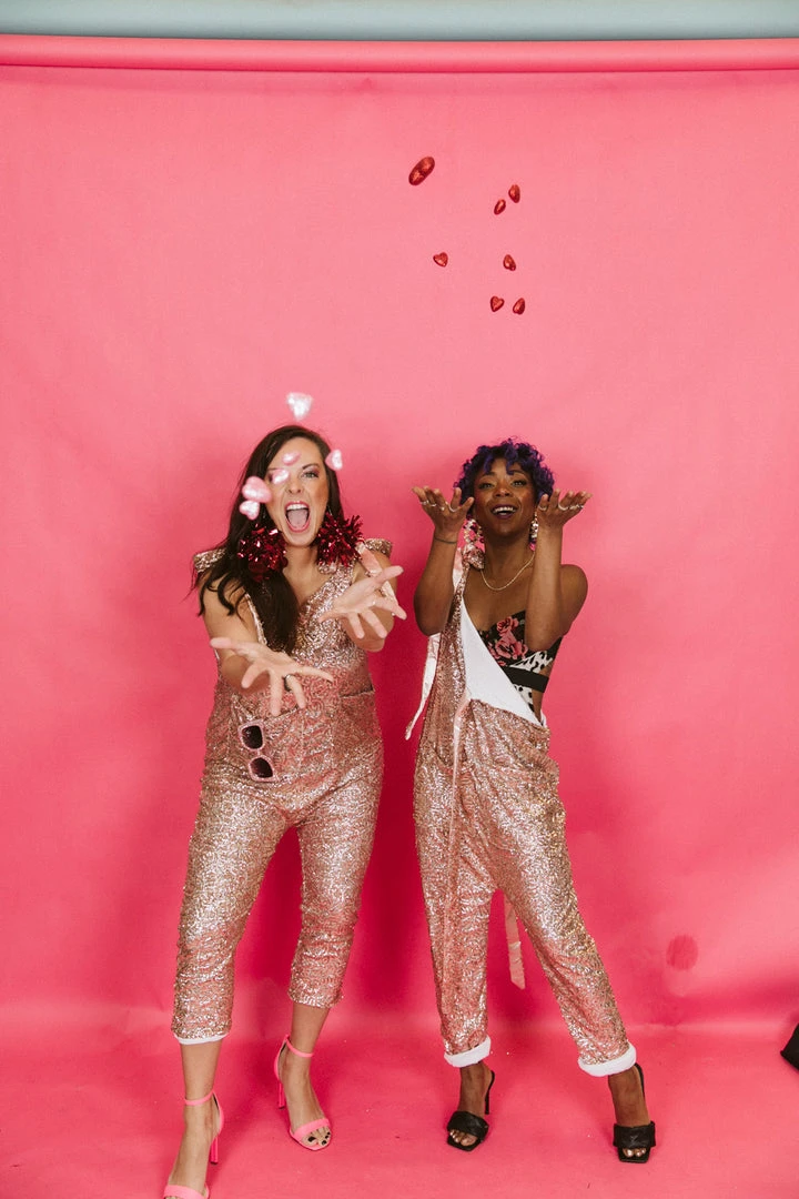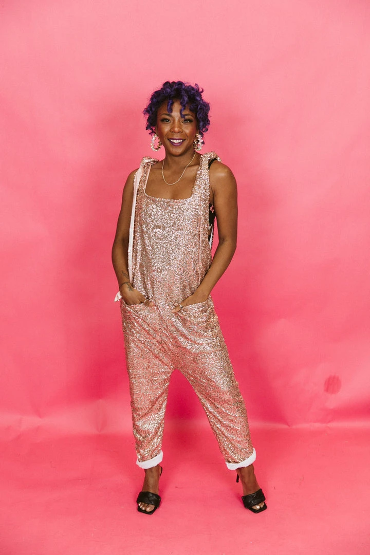 Our party jumpsuit  -rose gold adjustable tie sequin jumpsuit with pockets.Â