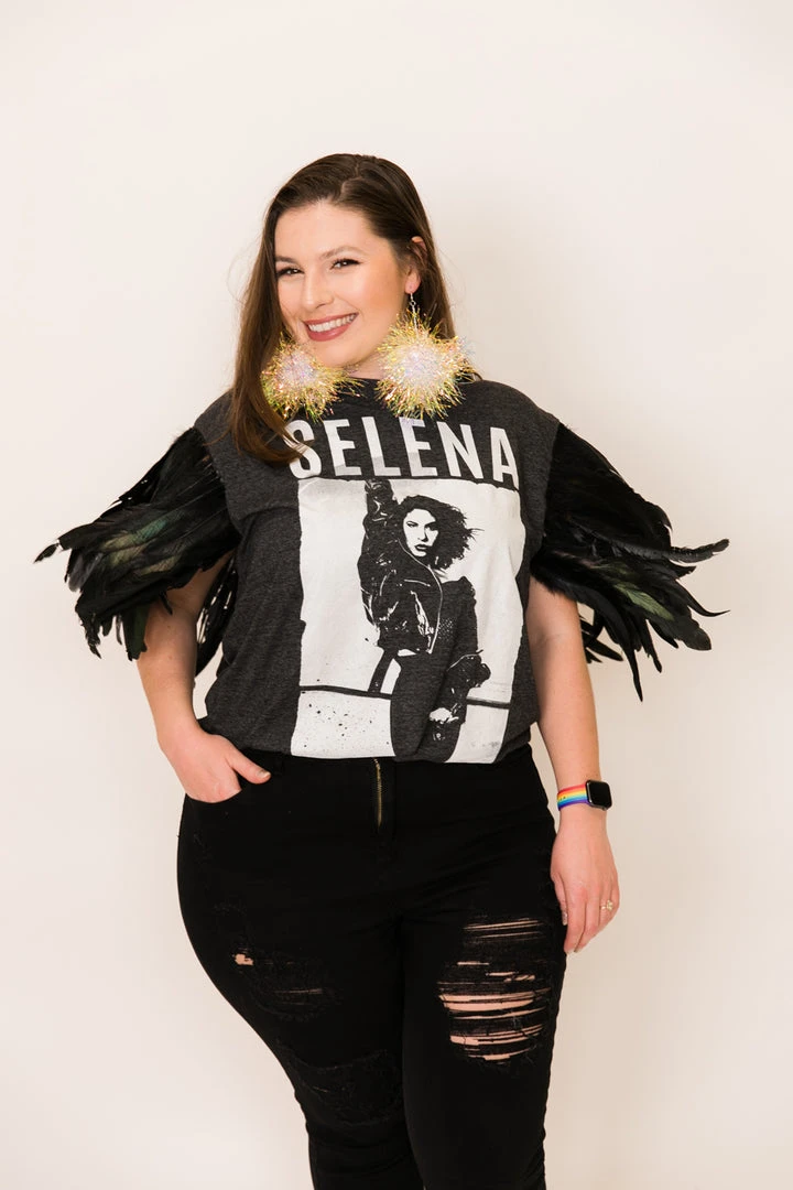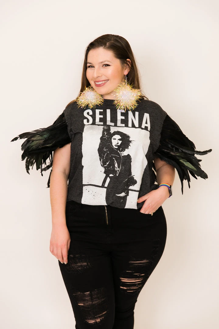 Our one of a kind party tee -Selena feather party tee. T-shirt is made of cotton.