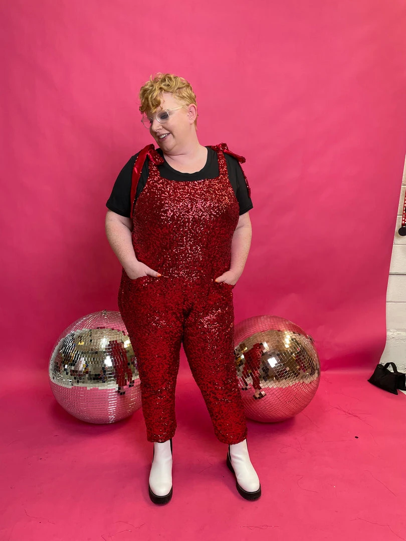 Our party jumpsuit  -red adjustable tie sequin jumpsuit with pockets.Â