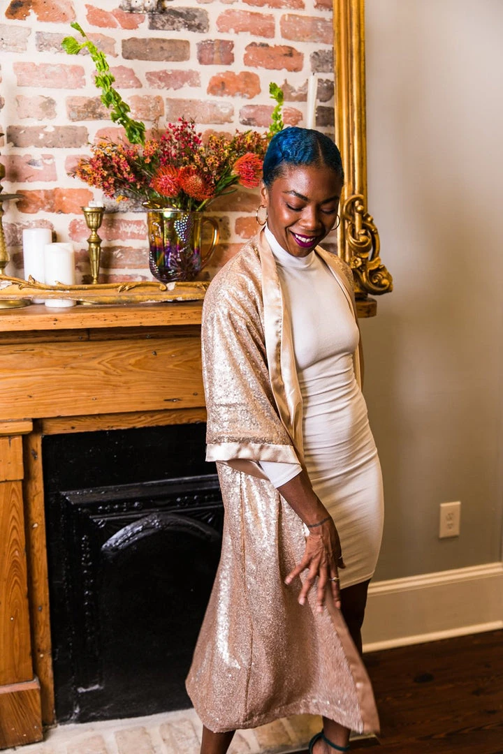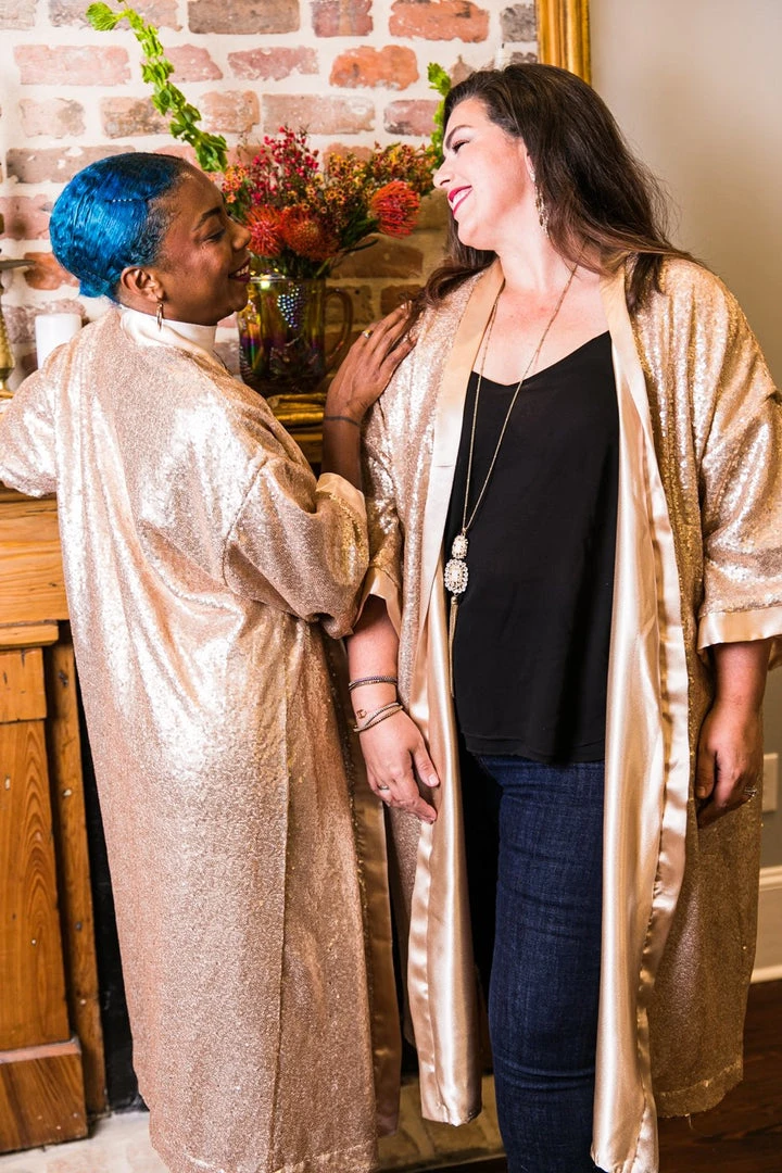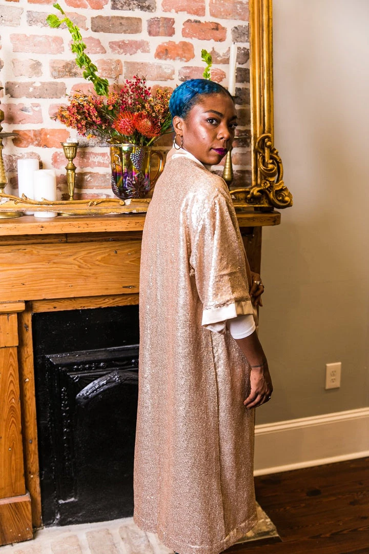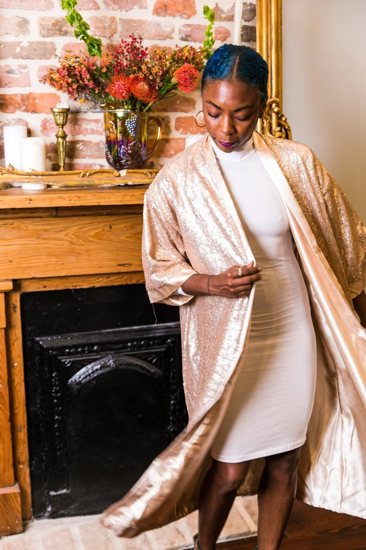 Sequin Duster Jacket with champagne glitz sequins and champagne satin.