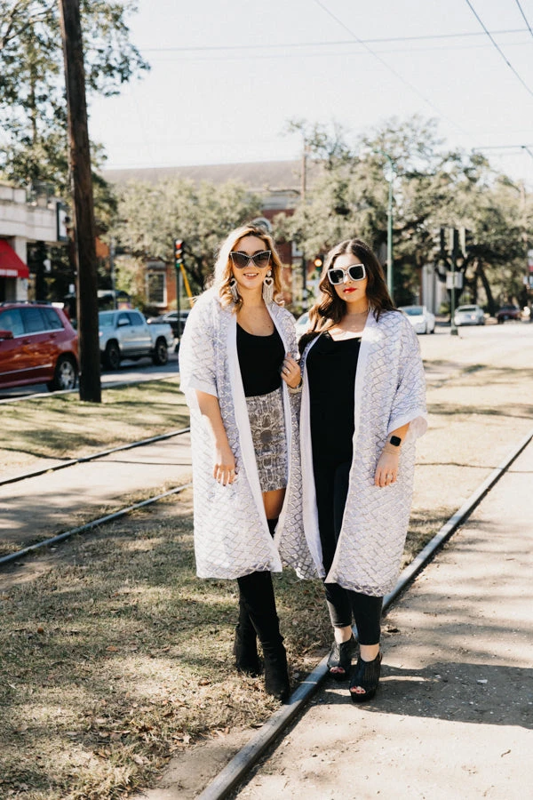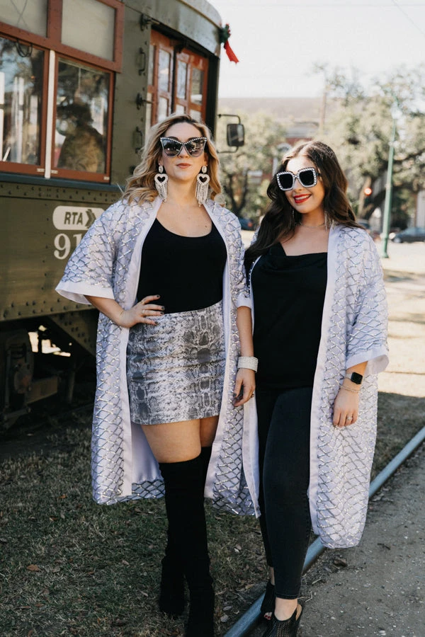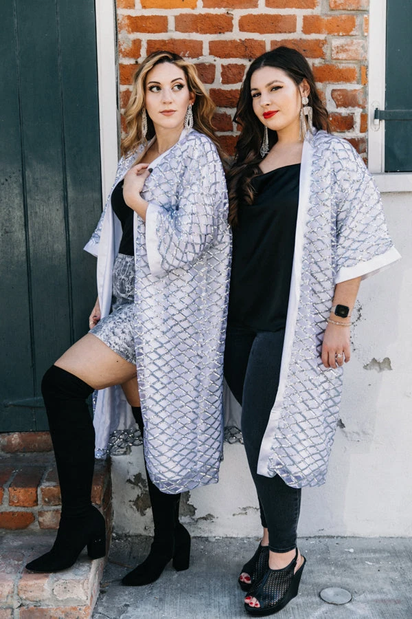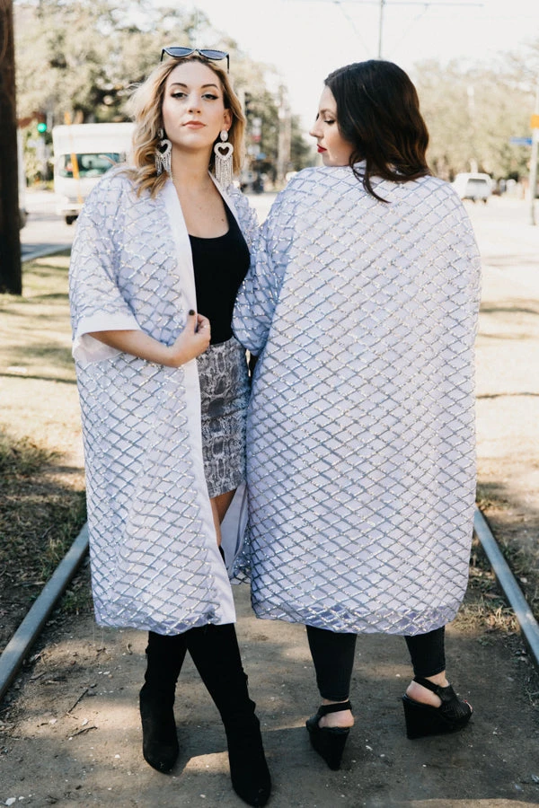 Sequin Duster Jacket with silver sequin diamonds fabric and white satin.