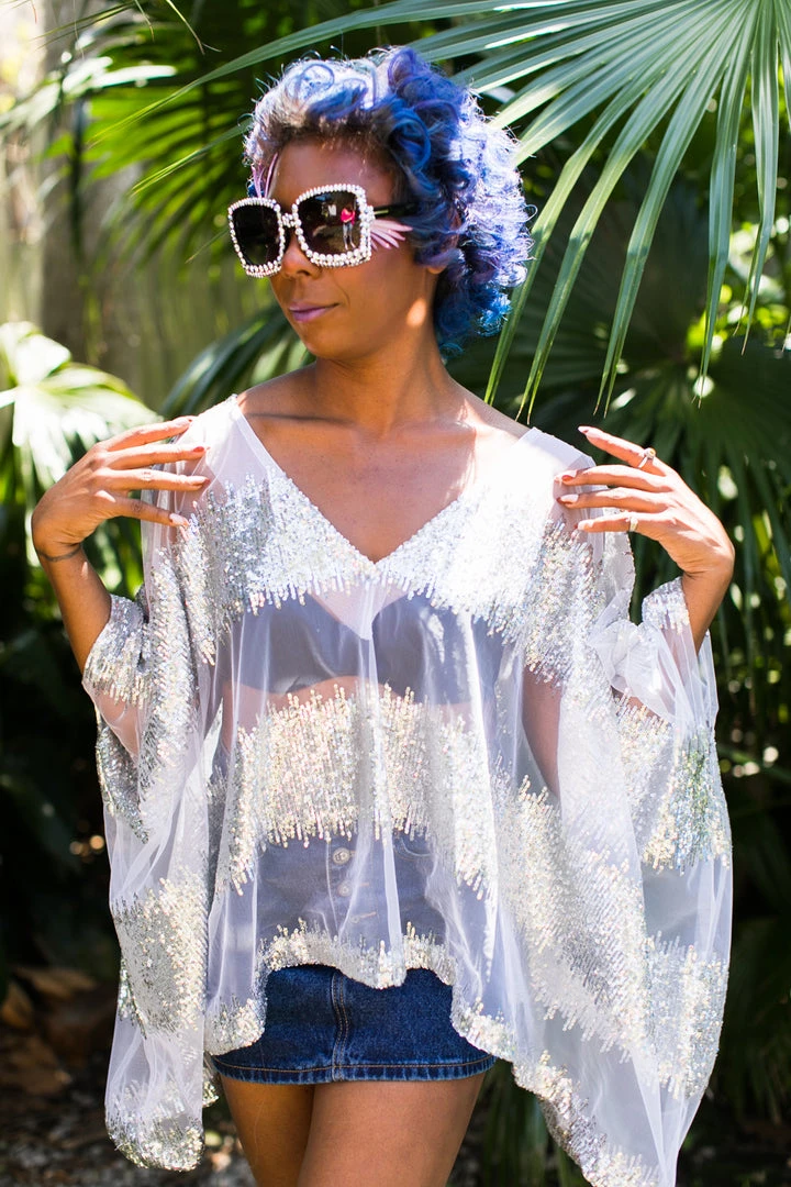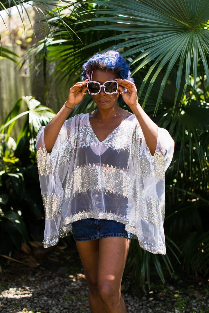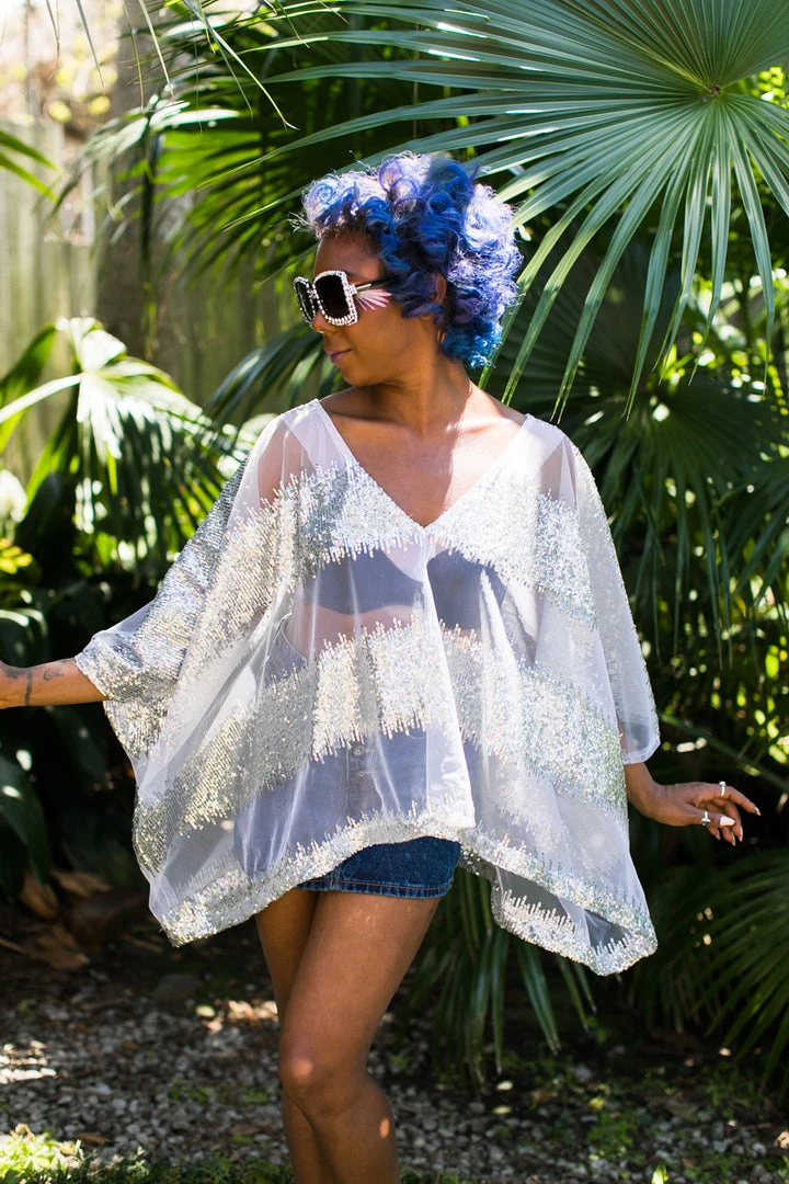 Silver sequin and sheer tulle tunic.