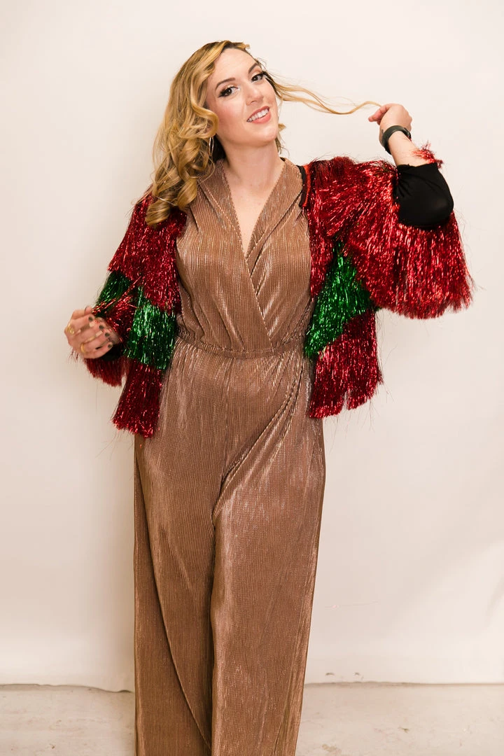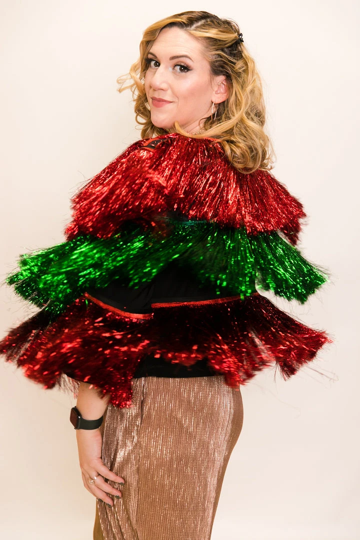 We can one-up your ugly sweater parties with this limited edition red and green tinsel jacket. Super limited quantities, for the holidays only.