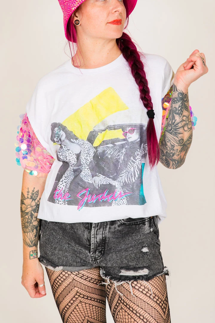 Our one of a kind party tee  – The Judds pink iridescent sequin party tee. T-shirt is made of cotton.Â