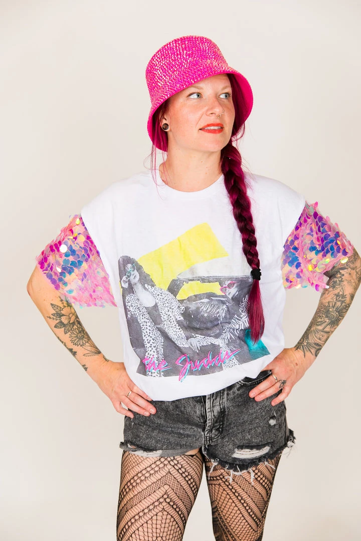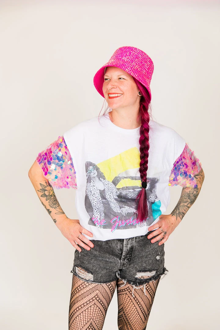 Fringe Co Party Tees Madonna Neon Pink Sequin Sleeve Party Tee