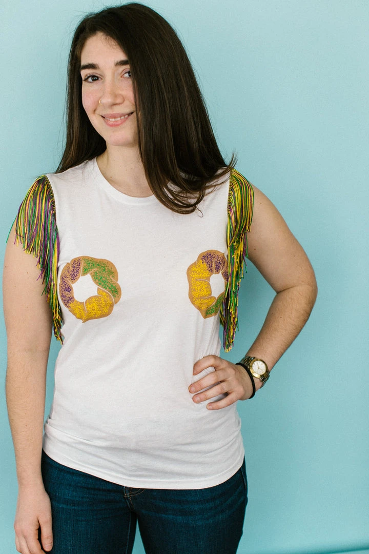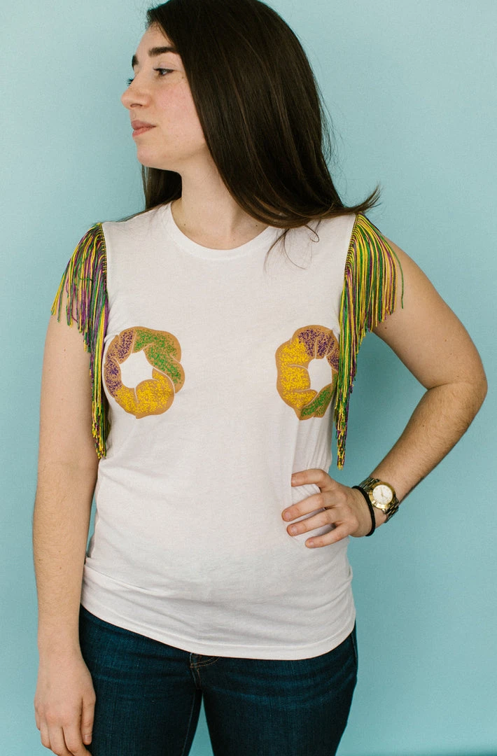Available for purchase with sequin sleeves, fringe sleeves, or standard sleeves.