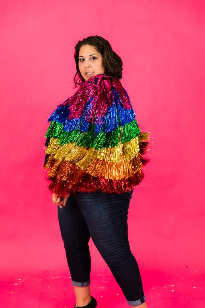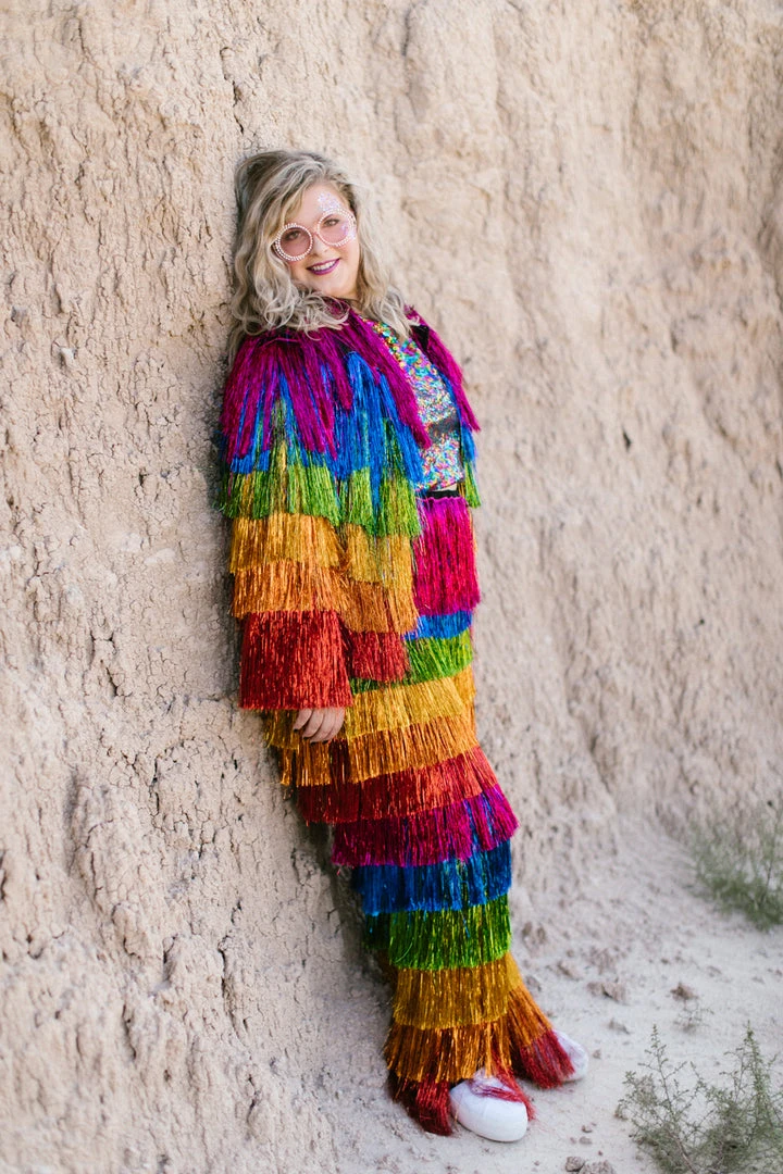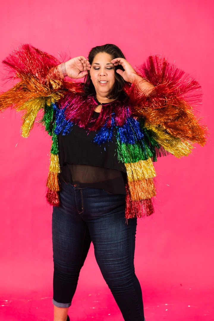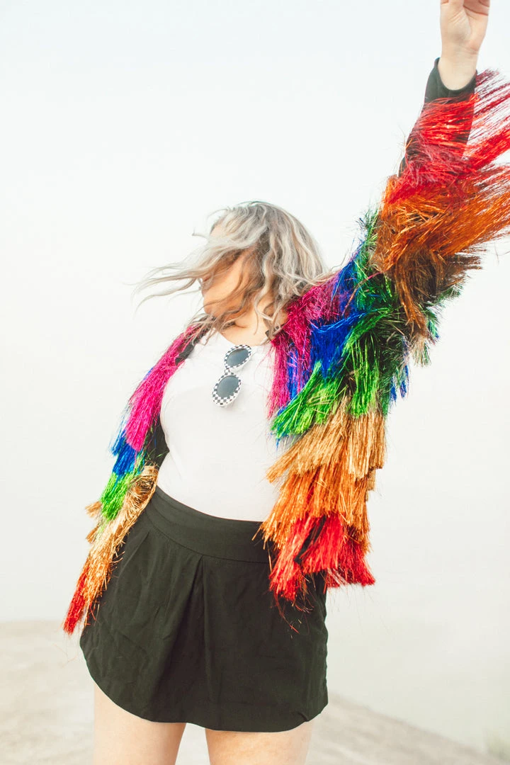 Rainbow metallic tinsel jacket. The Rebel is always ready to skirt the rules and crash a party. Â