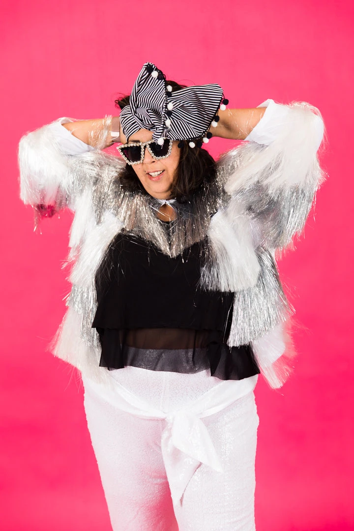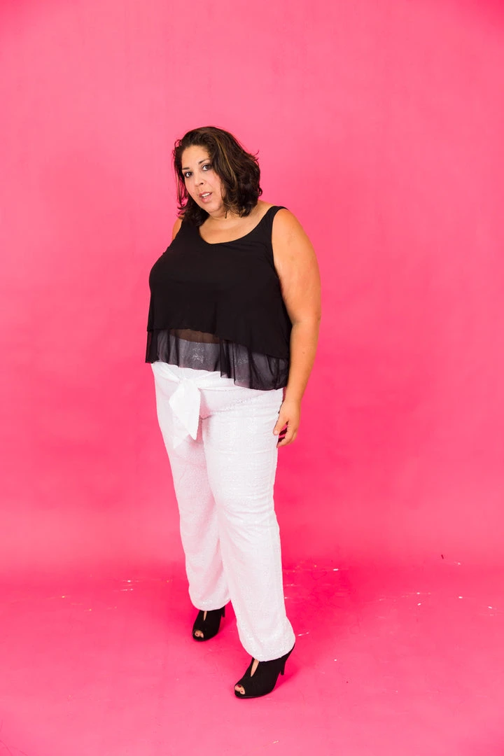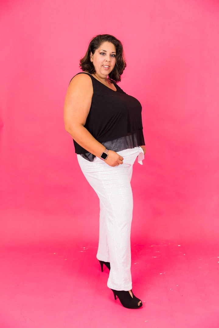Our party pant – white high waisted sequin pant. Jersey lined for amazing comfort. It’s like a party loungewear.