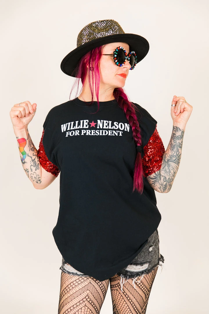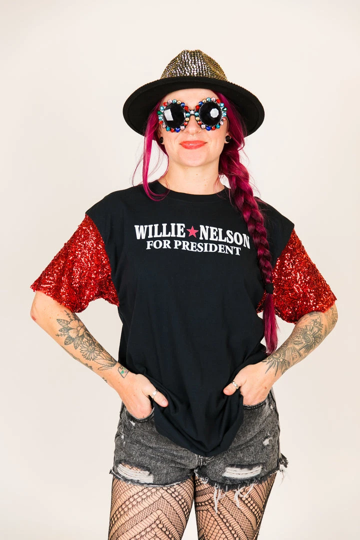 Our one of a kind party tee  – Willie Nelson red sequin sleeve party tee. T-shirt is made of cotton.Â