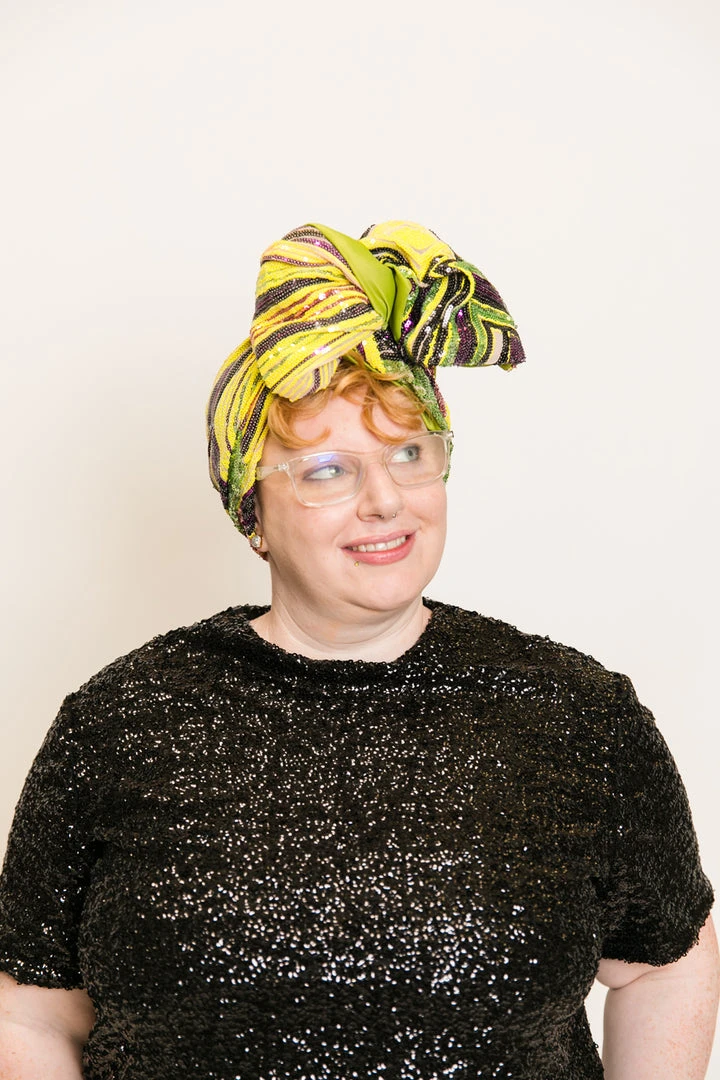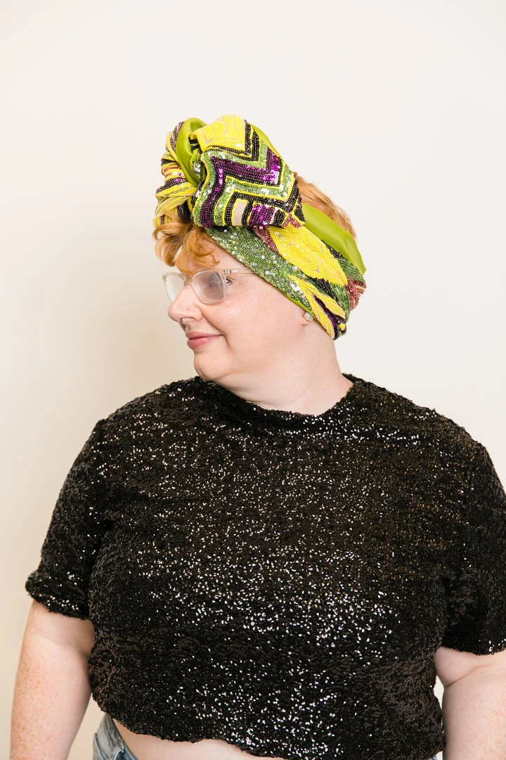 Our classic wrap  – made in yellow, purple and green sequins with a chartreuse satin backing.Â
